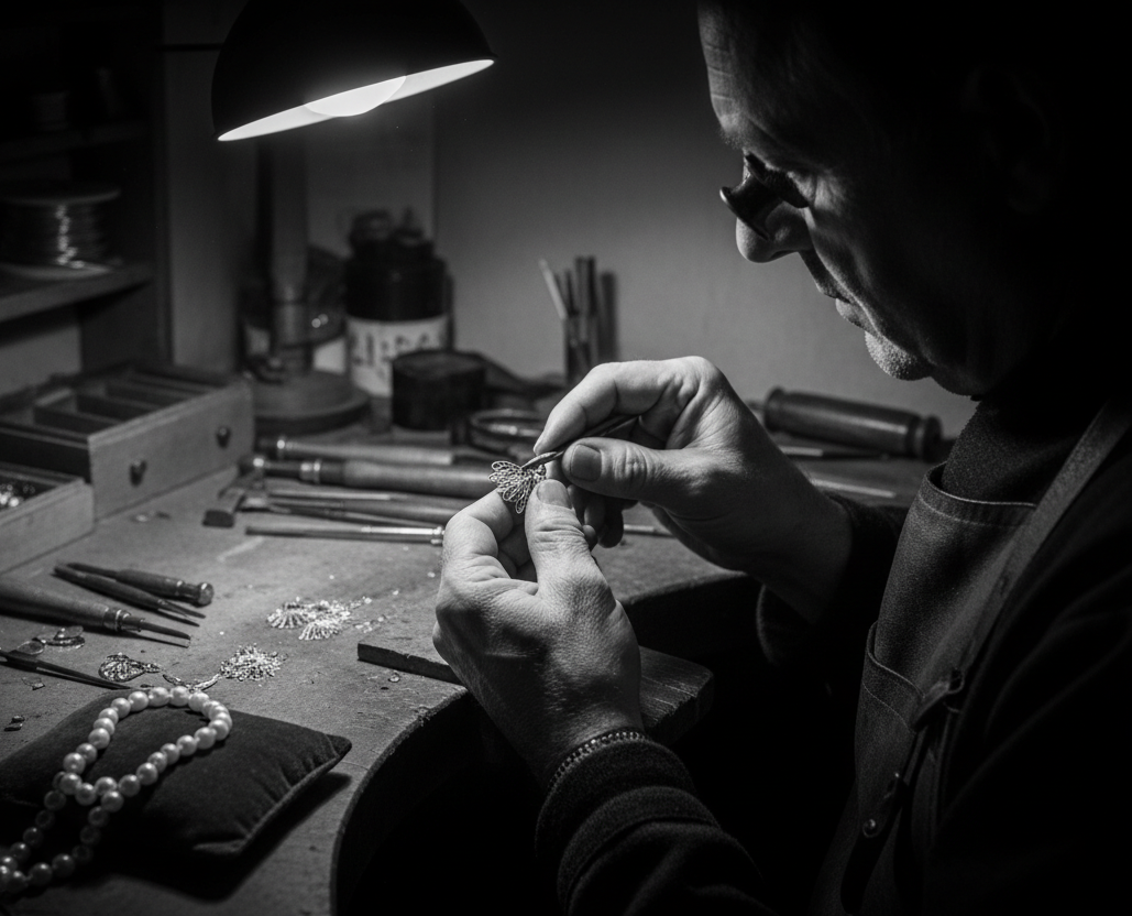 Från intrikat guldarbete till fin pärlsmyckesdesign präglades varje smycke av tålamod, skicklighet och kompromisslös precision.