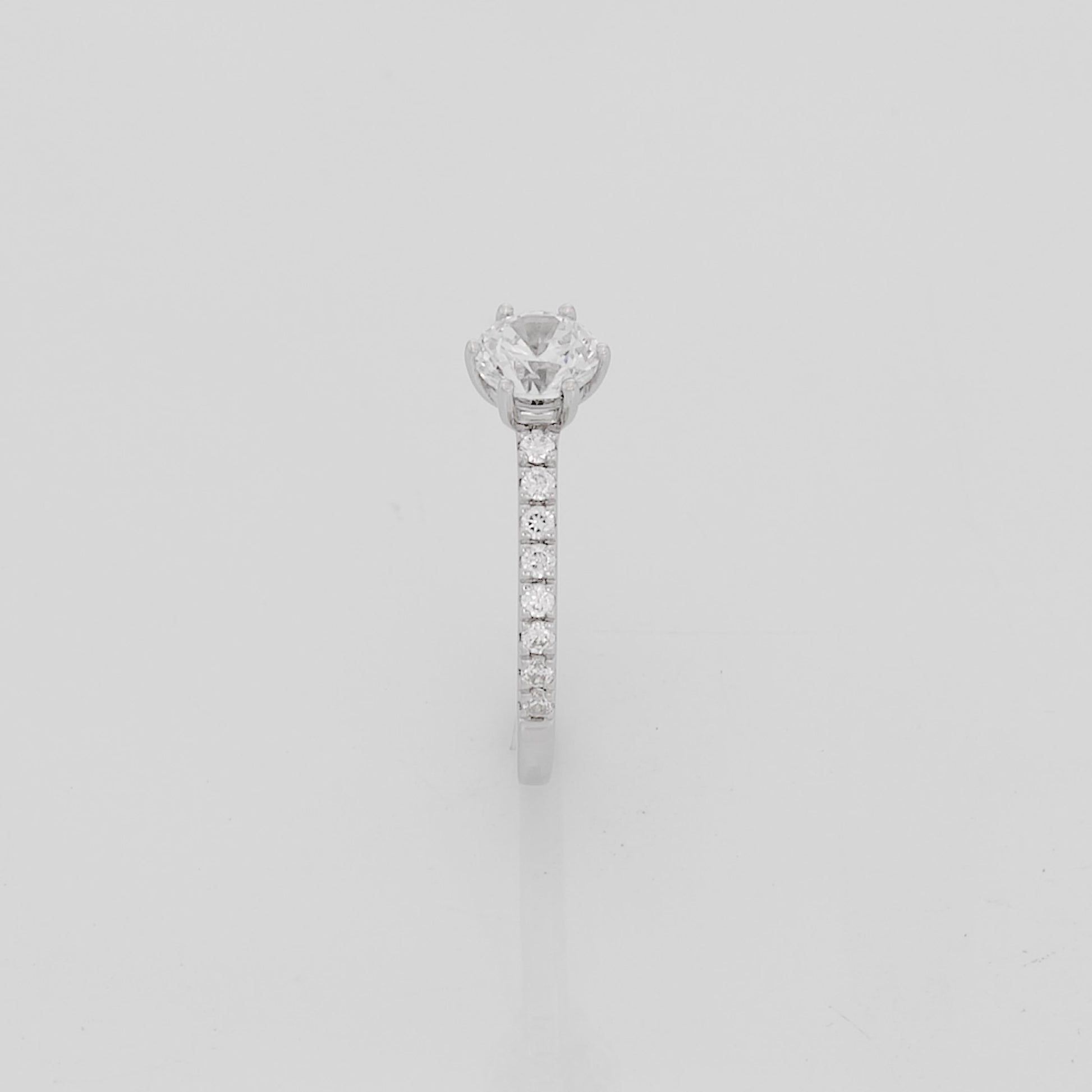 A modern engagement ring that exudes classic and sophisticated style. The side stone ring Felicia consists of a shimmering round center diamond surrounded by 6 elegant prongs. This setting allows maximum light transmission to the diamond, whose reflection thus becomes completely extraordinary. The ring's diamond-encrusted rail also enhances the shimmer of the center diamond, giving Felicia an irresistible charm. The side diamonds make up a total of approx. 0.28 Carat.