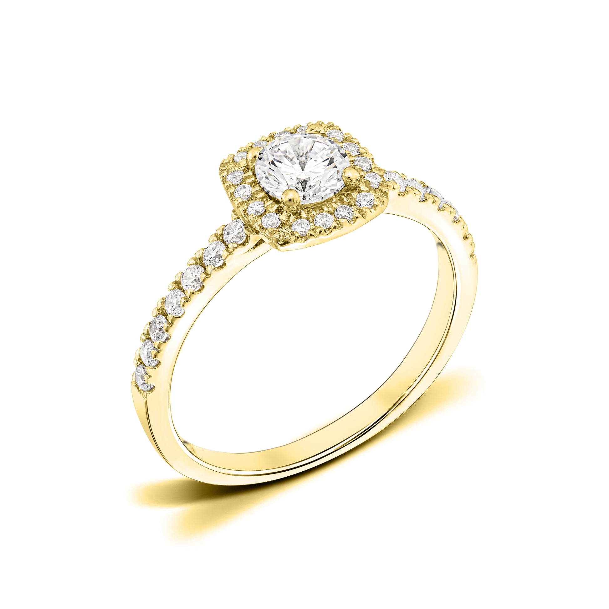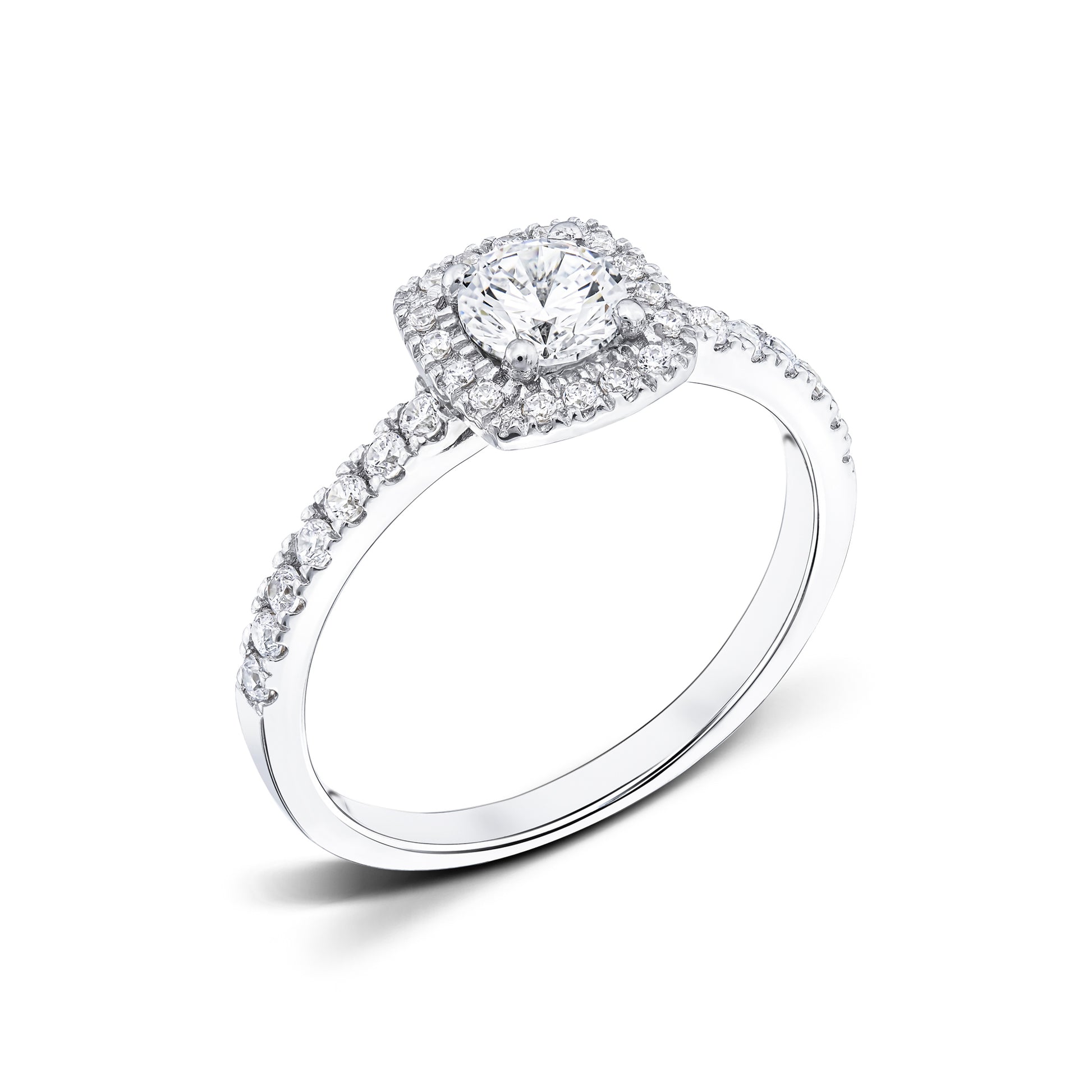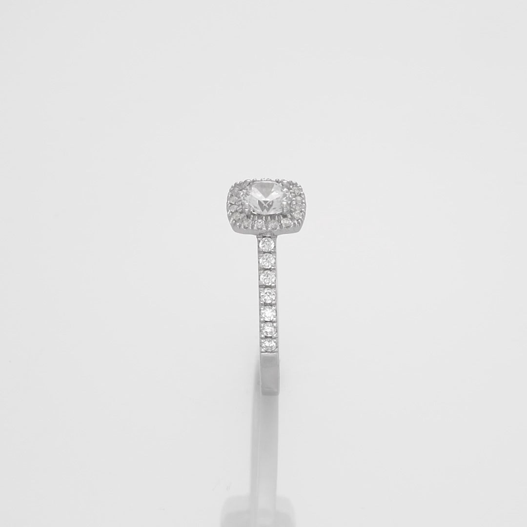 Emma is a ring that exudes outstanding beauty and captivating charm. It stands out from other rings with its unique square shape that gives it a distinct look. Each side diamond adorns the rail with an impressive shine and luminous power. In its radiant halo that frames the round center diamond, a unique magic is also emitted that enchants every glance. The halo diamonds and the side diamonds are a total of approx. 0.40 Carat.