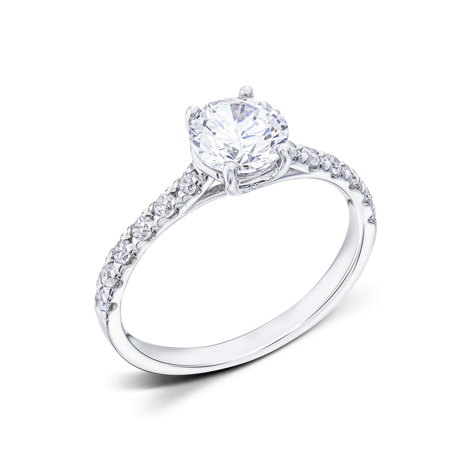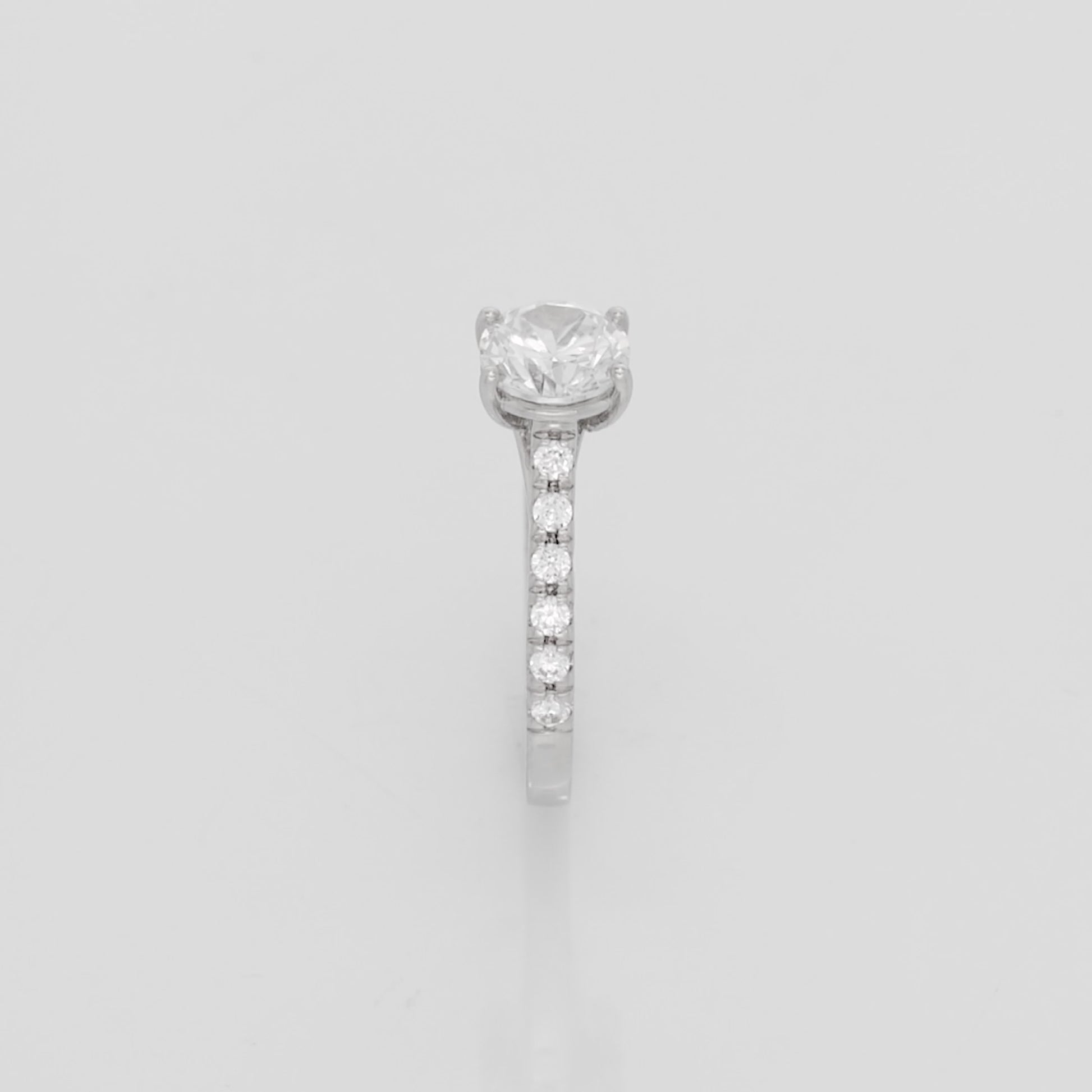 Flora, a side stone ring with a stylish and glamorous design. The classic round center diamond, embraced by 4 subtle prongs, enchants all who lay eyes on it. The side diamonds, with a total weight of approx. 0.10 Carat, also let the ring constantly stand in the spotlight with its generous shimmer. If you want a timeless and exclusive ring that stands out, Flora is the optimal choice for you. The size and number of the side diamonds are adjusted to the size of the center diamond to create the most ideal appearance of the ring.