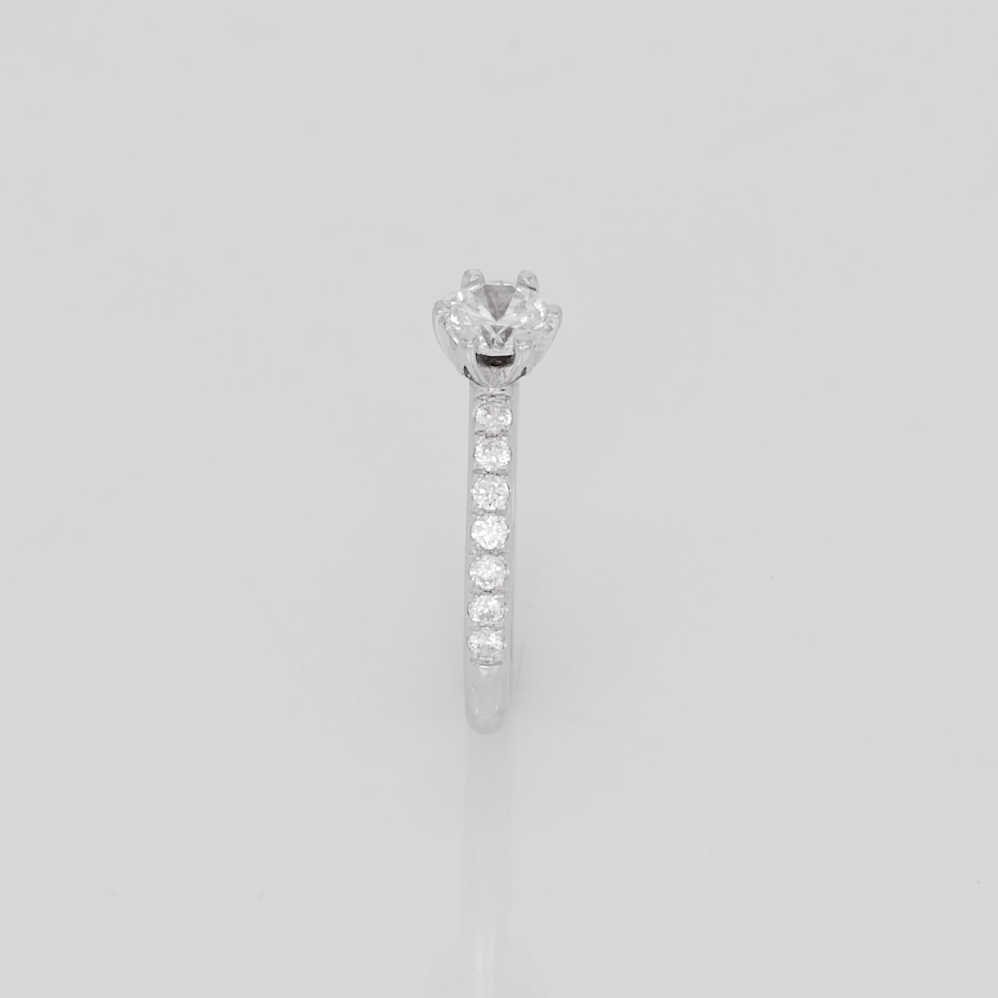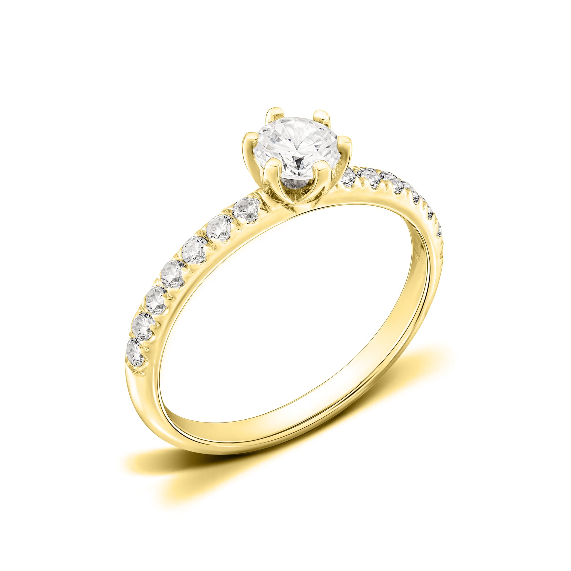 This beautiful side stone ring is a perfect combination of classic elegance and modern style. Bella's traditional round center diamond is attached with 6 prongs which make the stone the focal point and clearly highlighted in an elegant way. As a complement to the magical center diamond, the rail is adorned with side diamonds (total weight of approx. 0.30 Carat). The design certainly does not compromise with either exclusivity or stylishness.