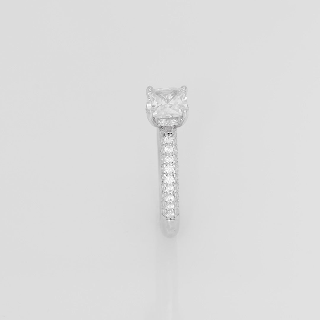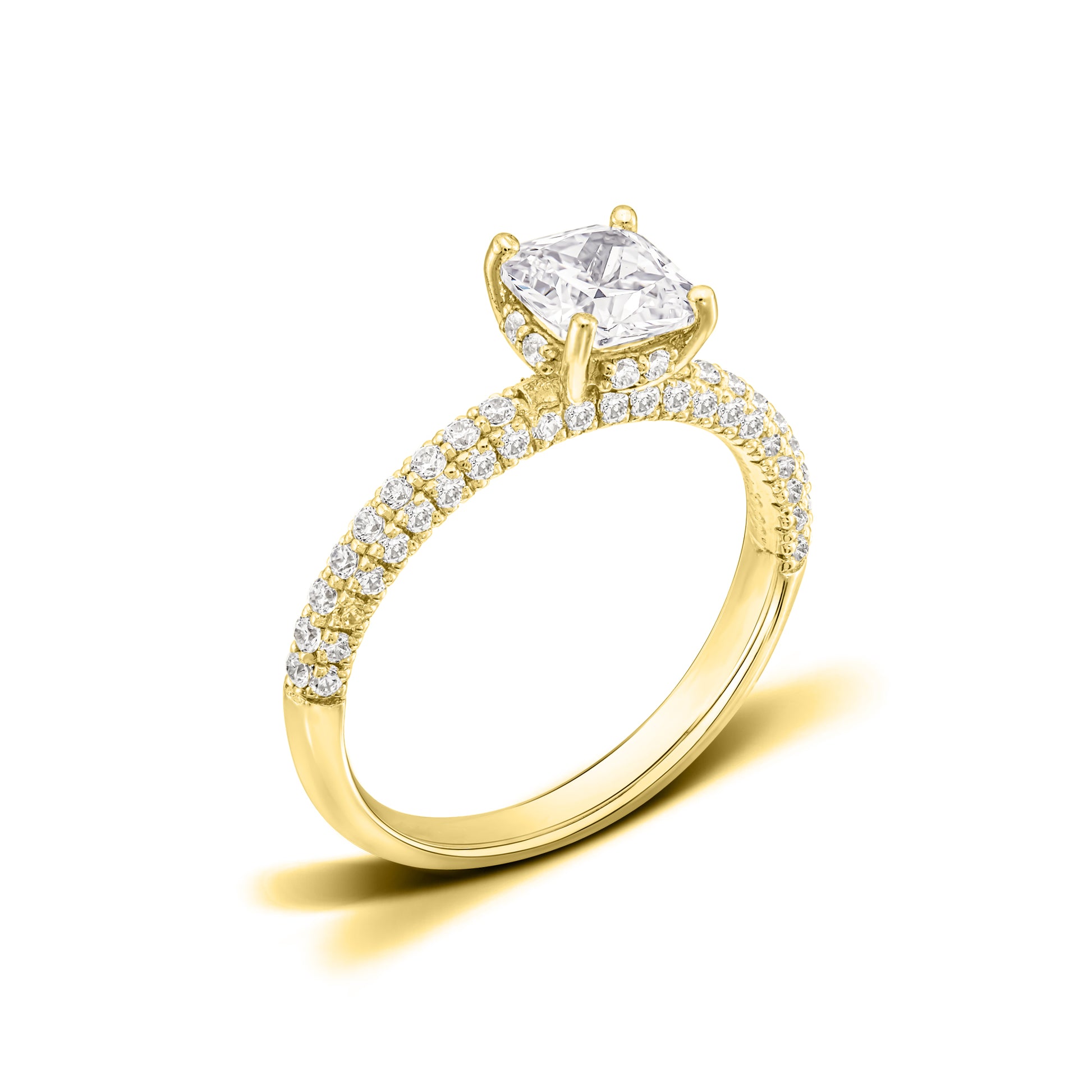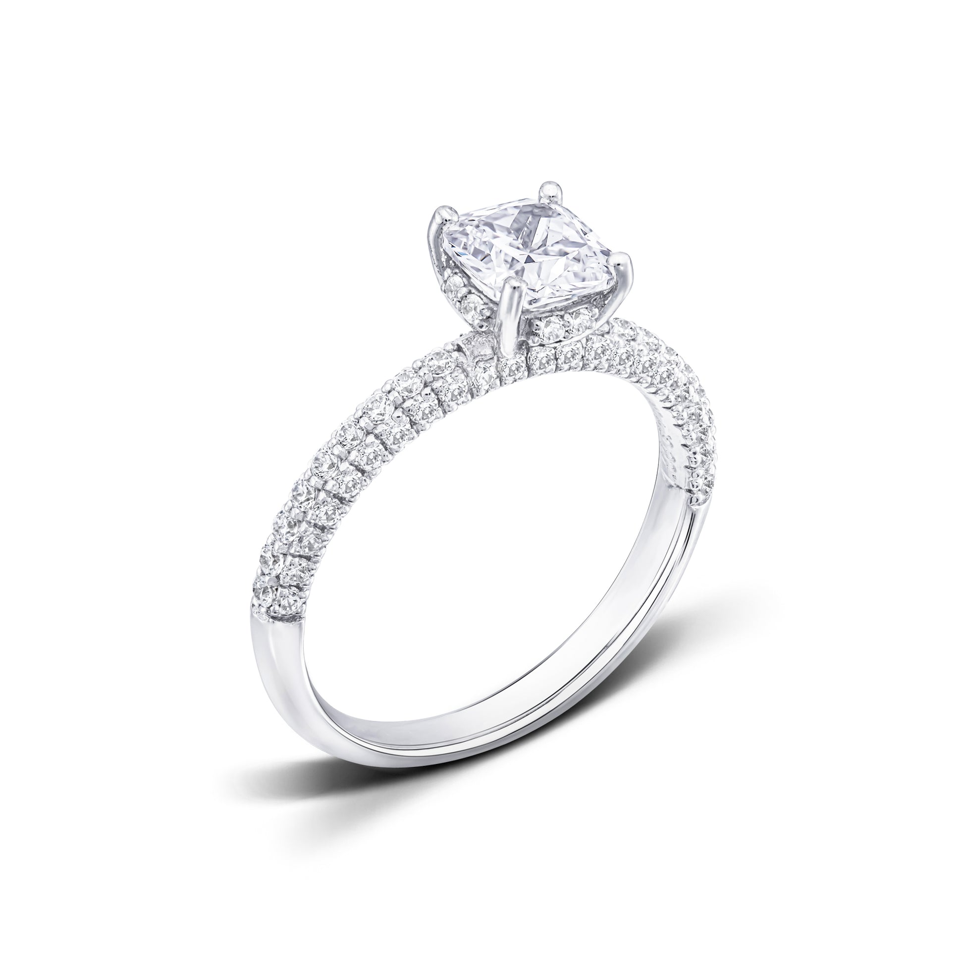 This side stone ring with 3 rows of side diamonds and an added touch of a hidden halo detail is a magnet for attention. With its brilliance from all dimensions, Laura is a pure eye-catcher. Its cushion cut center diamond gives the ring a unique design and signature. For those who want something elegant and at the same time Standing out from the crowd, Laura is definitely the ring for you. The halo diamonds and side diamonds together have a total weight of approx. 0.60 Carat.