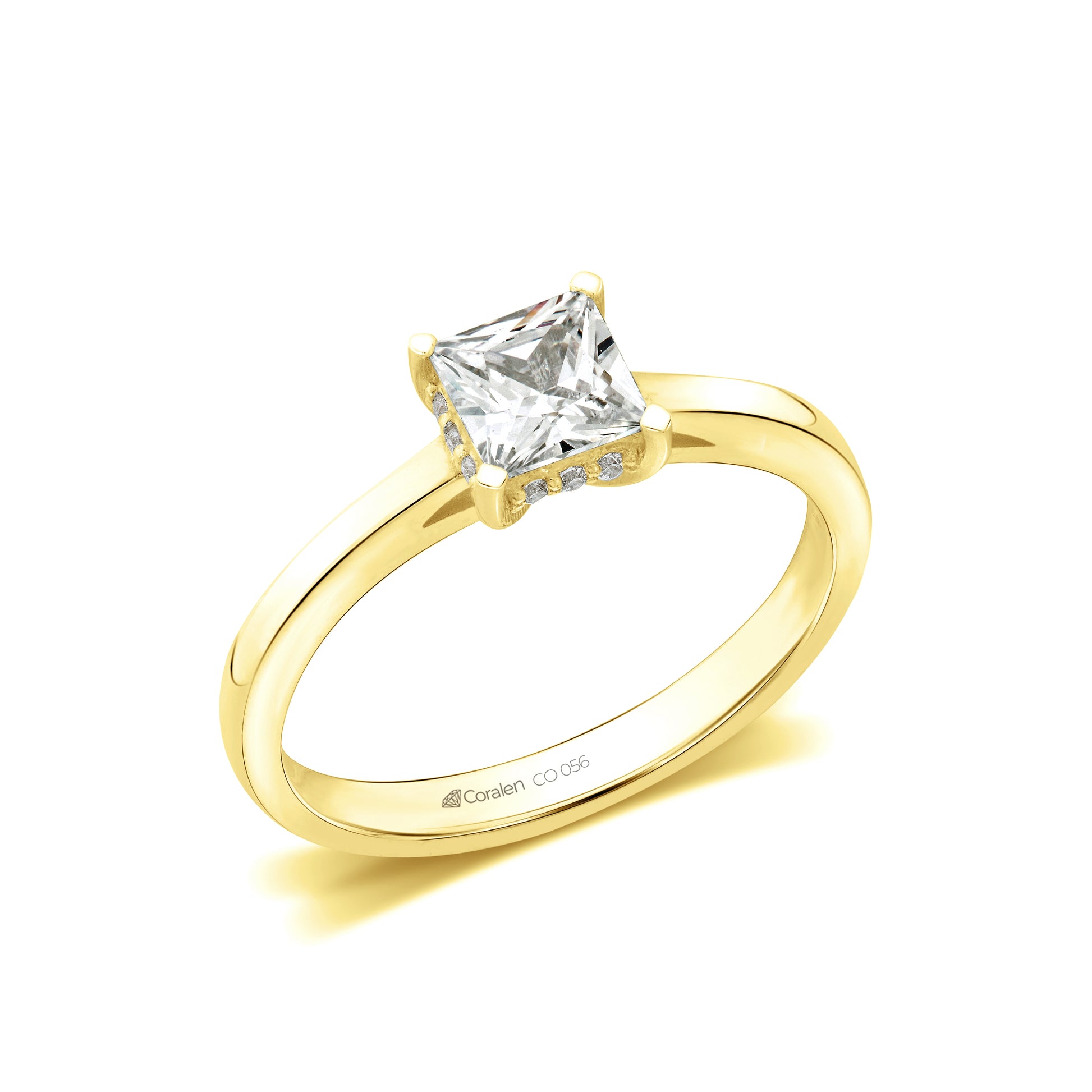 Esmeralda's extraordinary beauty catches your attention at first sight and makes you question everything else you previously found beautiful. This exclusive solitaire ring is adorned with a princess-cut center diamond that shines with its luminous power. To add an extra touch of magic, Esmeralda has a hidden halo detail whose diamonds have a total weight of approx. 0.06 Carat. This subtle detail makes the ring appear to be surrounded by an invisible radiance, enhancing the ring's shimmer and shimmer.