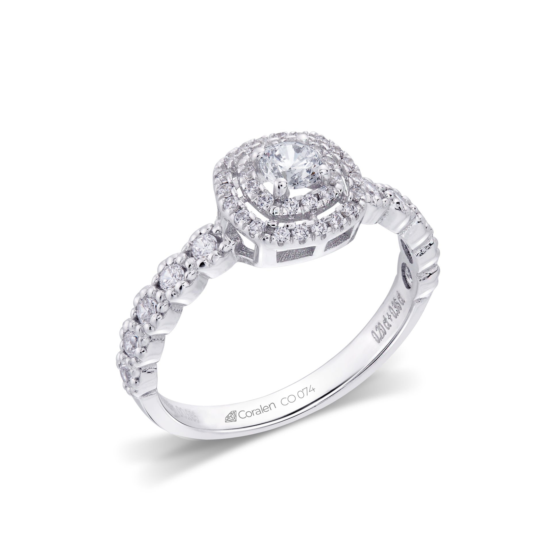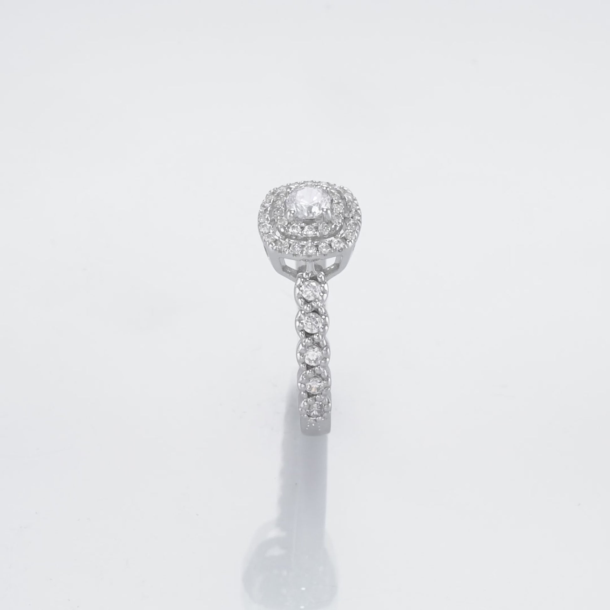 Georgina an extraordinary ring that makes the heart beat a little extra with its outstanding beauty and seductive design. Around the round center diamond, two perfect halos embrace the stone to give a luxurious and luminous effect. To give this crown a unique touch, it has been shaped like a swirl. Georgina's most unique feature, however, is its matchless shine, which is beautifully shaped after the shimmering round side diamonds. The halo diamonds and the side diamonds make up a total of approx. 0.36 Carat.