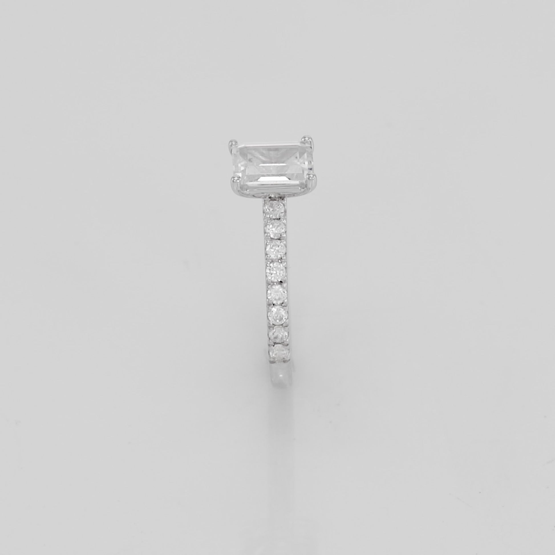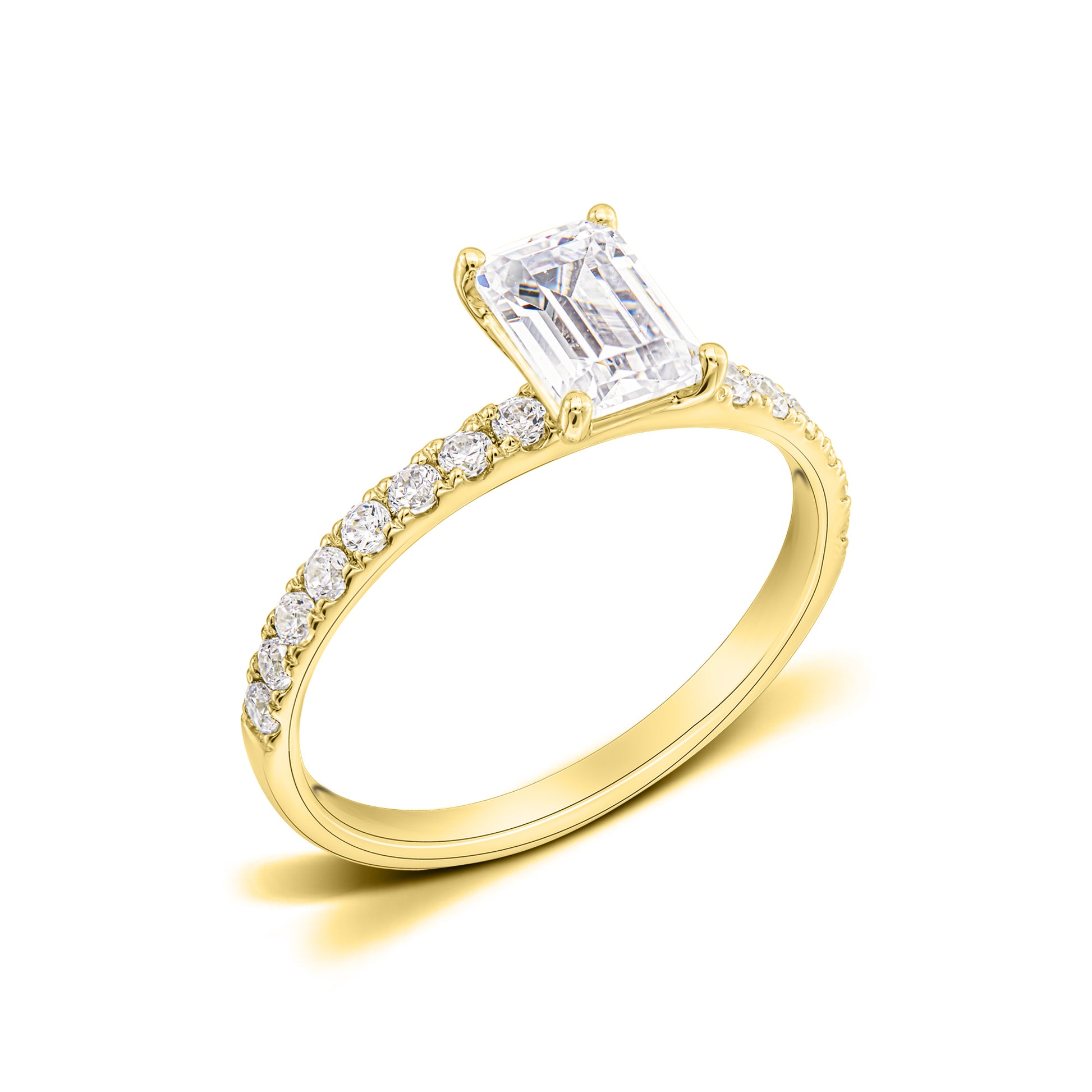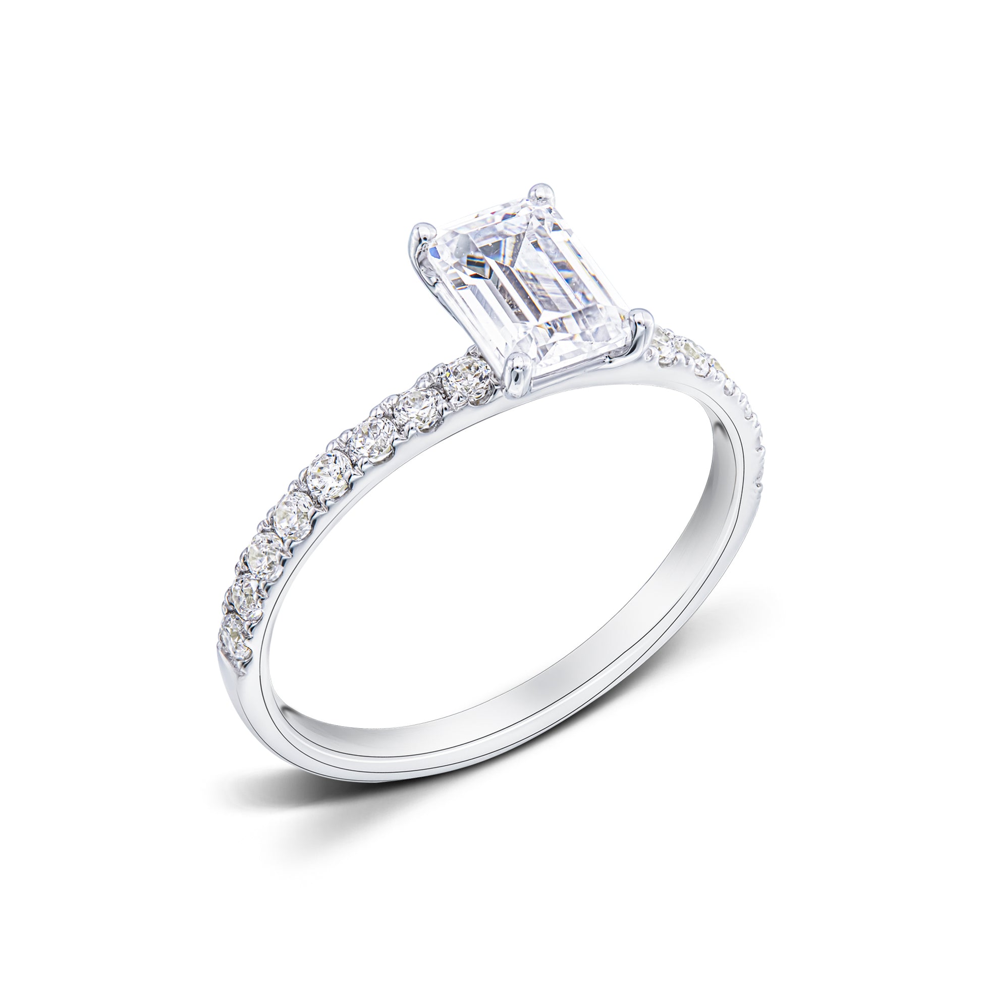 The timeless beauty of Emmie symbolizes nothing less than grand elegance. In the center shines a magnificent emerald-cut center diamond whose shape and depth give the ring a unique character. Along the glittering rail, the glamorous emerald-cut diamond meets shimmering side stones of approx. 0.32 carats creating harmony that captures both the eye and the heart.