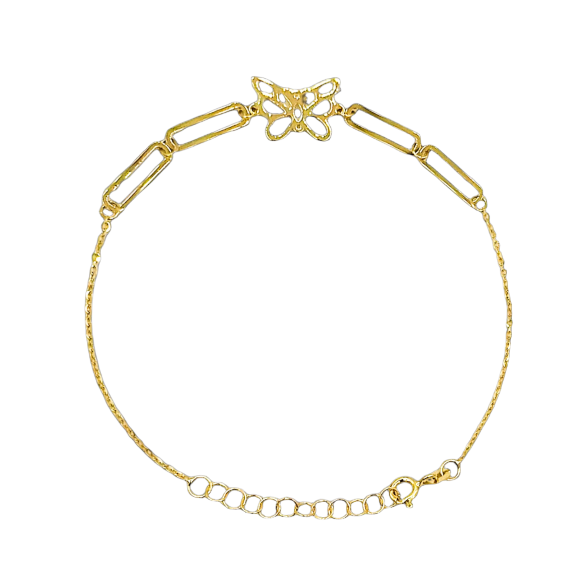 Ett elegant 18K guldarmband med en vacker fjäril som central detalj. Armbandet har en kombination av ankarkedja och moderna länksegment, vilket ger en stilren och feminin design. Perfekt för både vardagsbruk och speciella tillfällen.