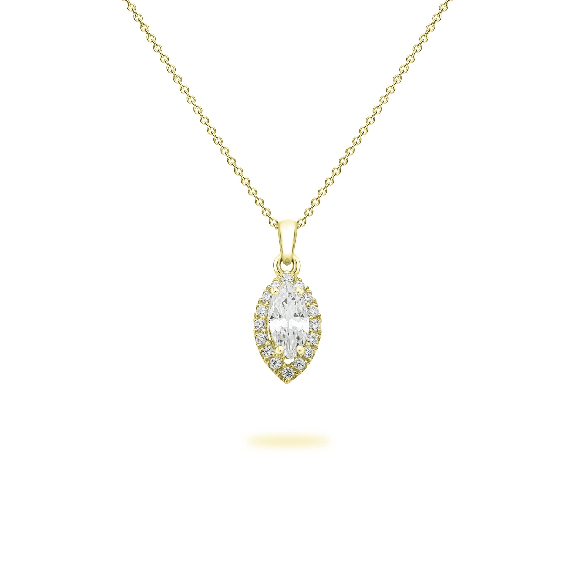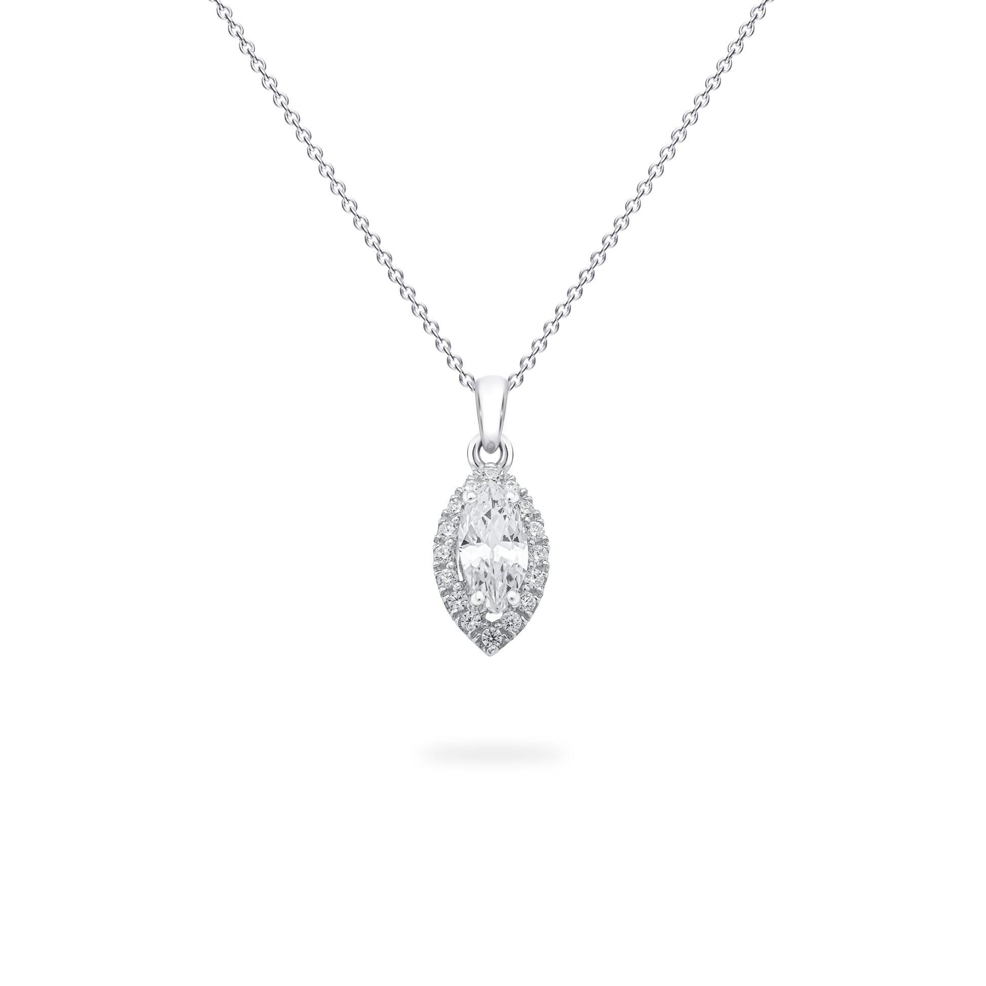The name Amira comes from Arabic and means "princess", which is exactly what you get with this pendant. Amira stands out from the crowd with her rare navel cut diamond that shines spectacularly with both beauty and shimmer. The halo design surrounding the diamond makes the pendant even more princess-like with its added sparkle and elegance. The halo consists of 16 diamonds totaling approx. 0.24 Carat.