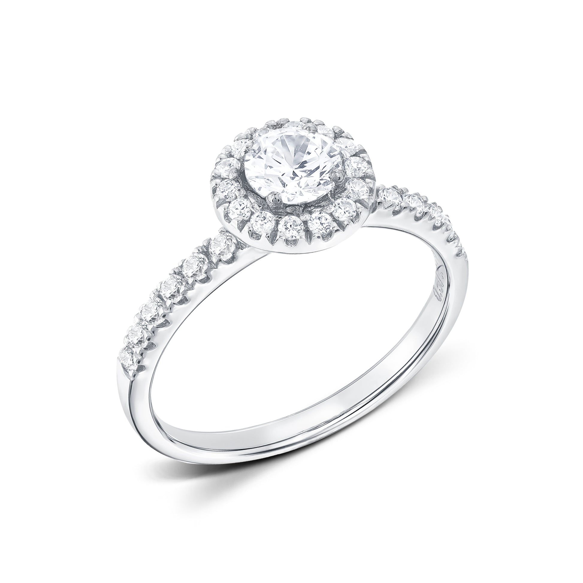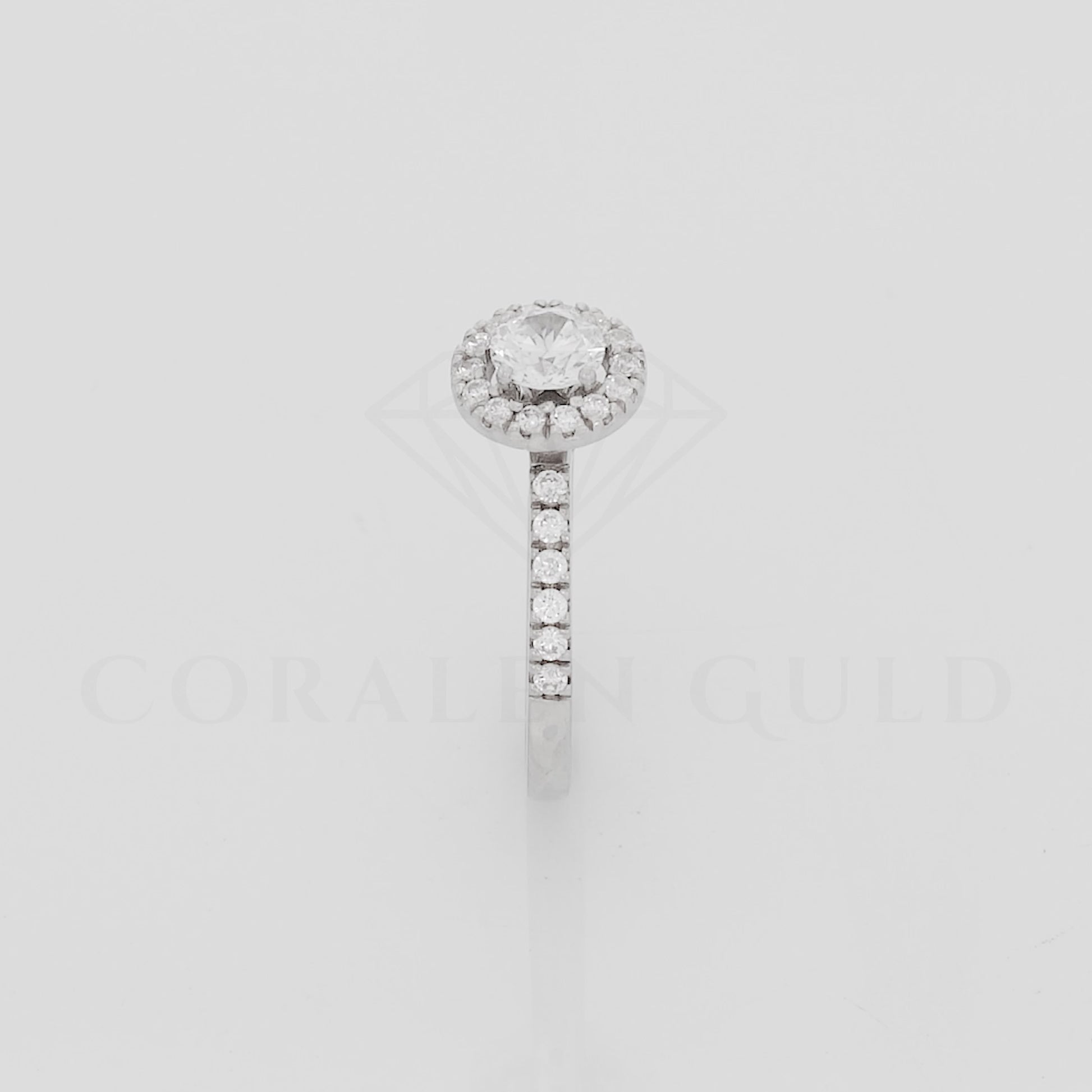 Fiona is a halo ring with the perfect combination of classic and modern design. The halo is formed by the smaller diamonds that surround the round center diamond. Along with the diamond-encrusted rail, Fiona gives your finger a generous amount of shimmer. The ring exudes sophistication, elegance and purity of style, something that can never go out of style. The halo diamonds together with the side diamonds make up a total of approx. 0.40 Carat.