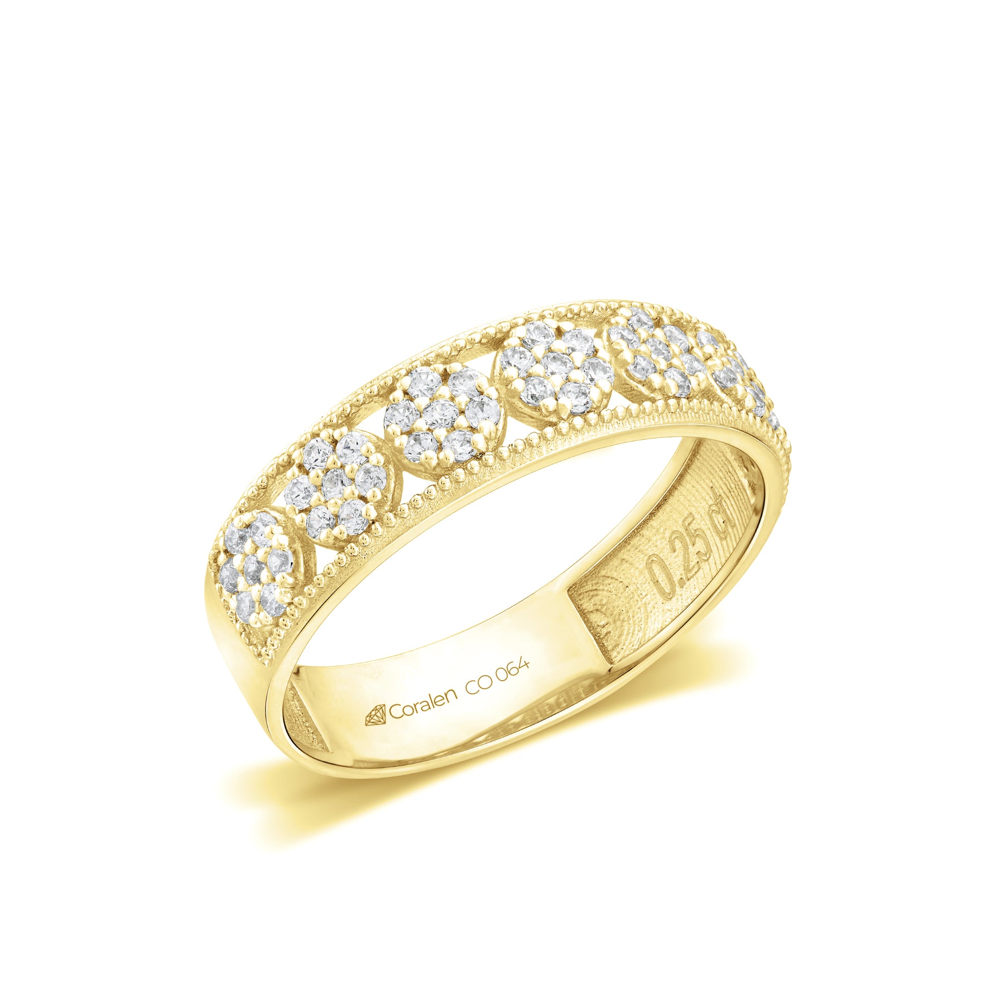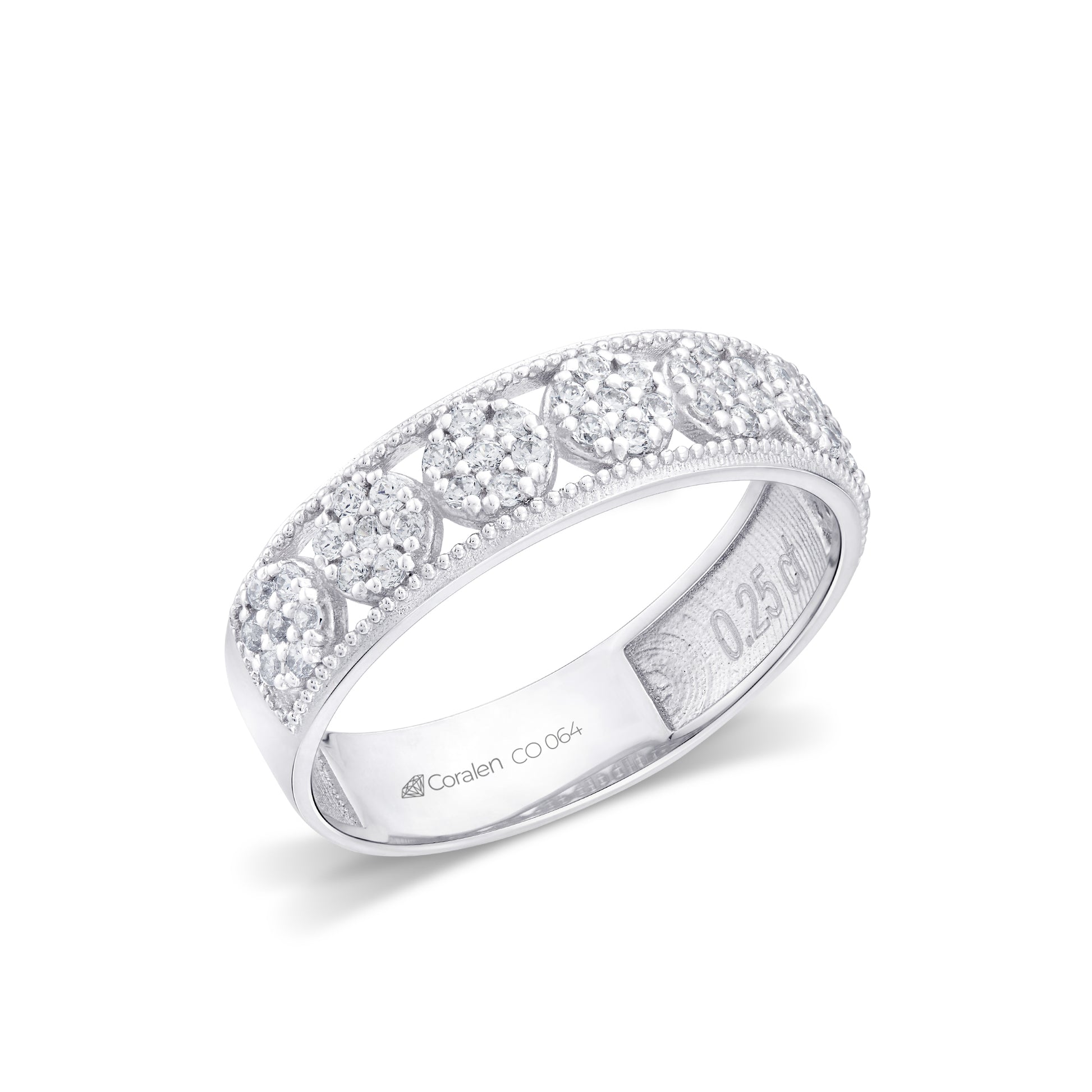 En unik ring vars charm får en att falla från första ögonkastet. Gianna pryds vackert av 7 cirklar fyllda med diamanter längs skenan som strålar obegränsat. Ringen har en utstickande design som passar perfekt för den som vill stå i rampljuset. Gianna passar som förlovningsring, vigselring eller statementring. Ringen består av totalt 49 diamanter som totalt utgör ca 0.34 Carat.